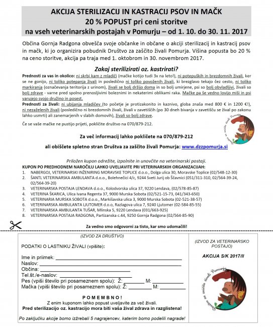 Občina Gornja Radgona obvešča svoje občanke in občane o akciji sterilizacij in kastracij psov in mačk, ki jo organizira pobudnik Društvo za zaščito živali Pomurja. Višina popusta bo 20 % na ceno storitve, akcija pa traja med 1. oktobrom in 30. novembrom 2017.
