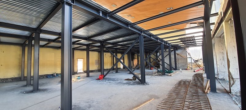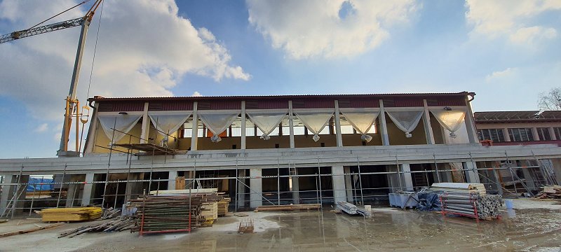 V stari dvorani so izvedene talne plošče prvega prostora, položene armature druge talne površine, pričelo se je z izrezom obstoječih betonskih sten za potrebe prehodov, izvedla se je kovinska konstrukcija podesta, popravil oplesk, pričelo se je barvanje s požarno barvo in pristopilo k izvedbi novega prizidka med šolo in dvorano.