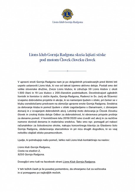 V upravni enoti Gornja Radgona nam je po dolgoletnih prizadevanjih pred štirimi leti uspelo ustanoviti Lions klub, ki vse od takrat izjemno aktivno deluje. Postali smo del velike slovenske družine, Zveze Lions klubov, ki združuje 59 Lions klubov z okoli 1.500 člani in 19 Leo klubov z 200-članskim podmladkom. Devetindvajset uglednih lionistk in lionistov iz občin Apače, Gornja Radgona, Radenci in Sv. Jurij ob Ščavnici izvajamo dobrodelne projekte in akcije, ki so namenjeni ljudem v stiski, pri čemer se v klubu osredotočamo predvsem na območje upravne enote Gornja Radgona. Sredstva za delovanje kluba in pomoč ljudem v stiski zagotavljamo s članarinami, z zbiranjem donacij in z izvajanjem dobrodelnih akcij. Letošnji moto delovanja je Človek človeku človek in znotraj kluba deluje Odbor za dobrodelnost, ki obravnava prispele prošnje za denarno pomoč. V lionističnem letu 2019/2020 smo izvedli več akcij in za različne namene donirali denarna in materialna sredstva. Tako smo npr. pomagali pri nabavi računalnikov za šoloobvezne otroke, nakupu koncertnega klavirja za Glasbeno šolo Gornja Radgona, obdarovanju starostnikov in pri nizu drugih dogodkov, ki so vsaj nekoliko olajšali stiske posameznikom.