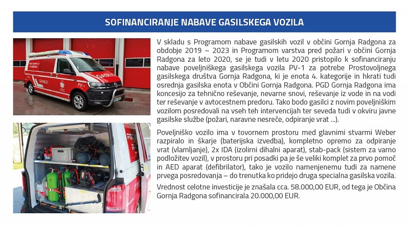 V skladu s Programom nabave gasilskih vozil v občini Gornja Radgona za obdobje 2019 – 2023 in Programom varstva pred požari v občini Gornja Radgona za leto 2020 se je tudi v letu 2020 pristopilo k sofinanciranju nabave poveljniškega gasilskega vozila PV-1 za potrebe Prostovoljnega gasilskega društva Gornja Radgona, ki je enota 4. kategorije in hkrati tudi osrednja gasilska enota v Občini Gornja Radgona. PGD Gornja Radgona ima koncesijo za tehnično reševanje, nevarne snovi, reševanje iz vode in na vodi ter reševanje v avtocestnem predoru. Tako bodo gasilci z novim poveljniškim vozilom posredovali na vseh teh intervencijah ter seveda tudi v okviru javne gasilske službe (požari, naravne nesreče, odpiranje vrat,...).