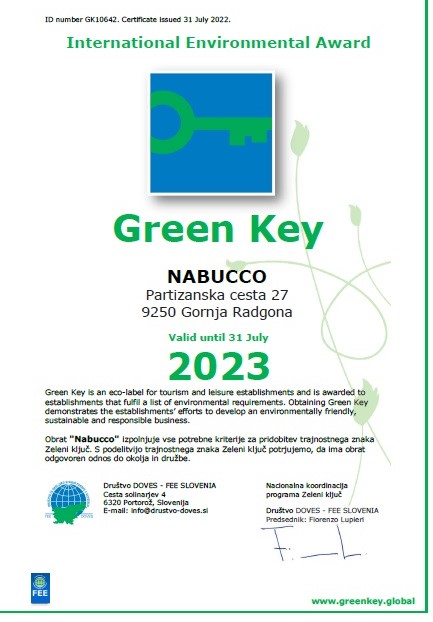 Kavarna in slaščičarna Nabucco v Gorni Radgoni in podjetje Radgonske gorice d.o.o. sta pridobila okoljski znak GREEN KEY / ZELENI KLJUČ, ki je vodilni standard na področju okoljske odgovornosti in trajnostnega delovanja v turistični industriji in pomeni zavezanost podjetij, da spoštujejo stroge kriterije, ki jih je določila Mednarodna fundacija za okoljsko vzgojo FEE.
