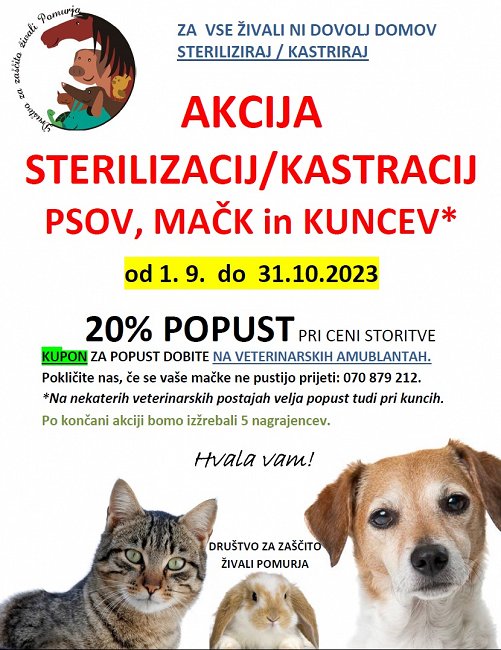 Akcija sterilizacij in kastracij psov, mačk in kuncev na vseh veterinarskih postajah v Pomurju - od 1. 9. do 31. 10. 2023